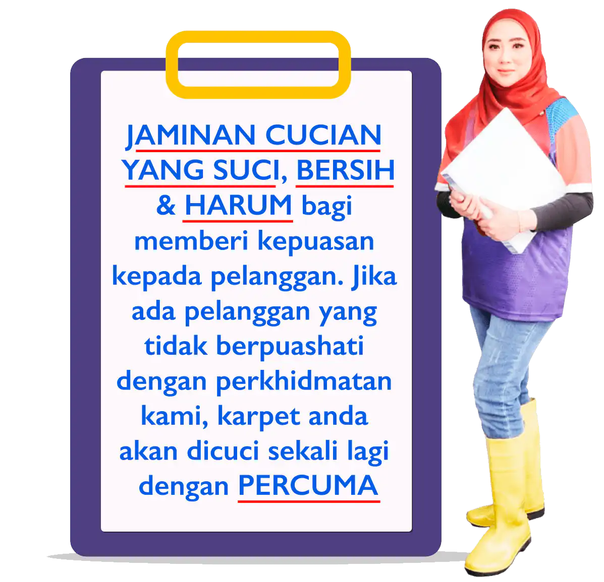 Kami mengambil tanggungjawab memastikan karpet yang telah dicuci dalam keadaan bebas najis.