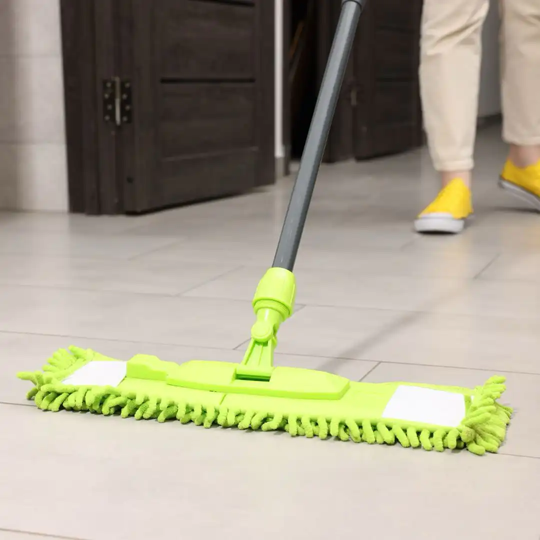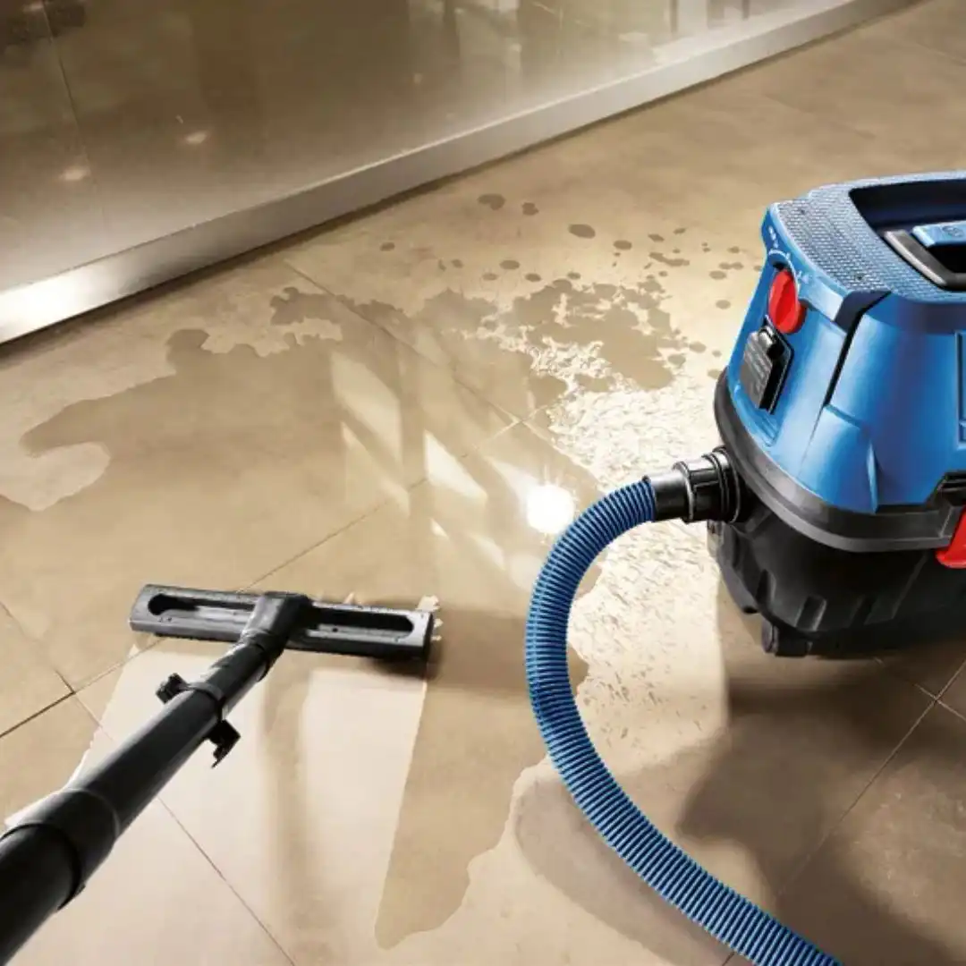 Habuk, pasir dan kotoran kasar akan dibuang menggunakan mesin penyedut atau mop kering bagi mengelakkan calar semasa proses cucian basah.