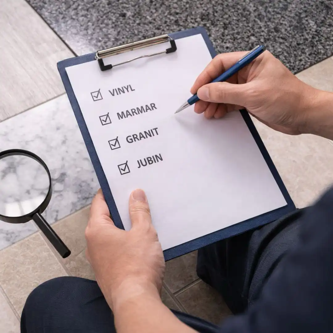 Jenis lantai seperti marmar, granit, jubin atau vinyl akan diperiksa terlebih dahulu bagi menentukan teknik cucian, mesin dan bahan kimia yang paling sesuai.
