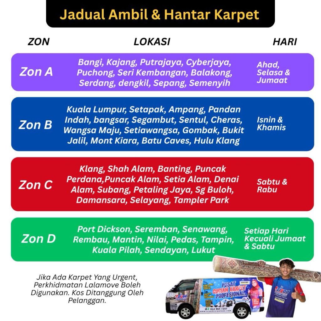 1. Pengambilan dan penghantaran pulang karpet adalah mengikut ZON kediaman anda